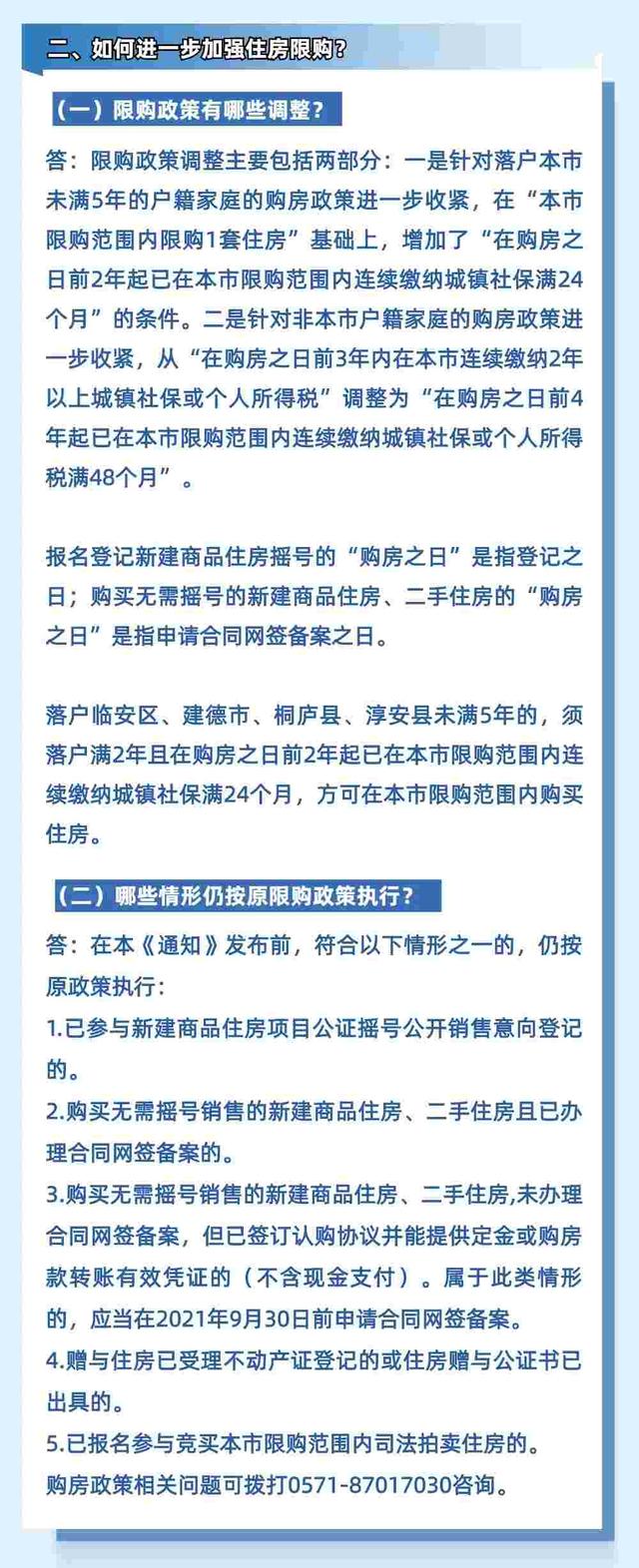 据杭州市住房保障和房产管理局8月5日消息,为认真贯彻落实党中央、国务院决策部署,坚持“房子是用来住的、不是用来炒的”定位,今天,杭州市房地产市场平稳健康发展领导小组办公室发布《关于进一步加强房地产市场调控的通知》(以下简称《通知》),从加强住房限购、完善新建商品住房销售管理、规范市场秩序三方面进一步加强调控。