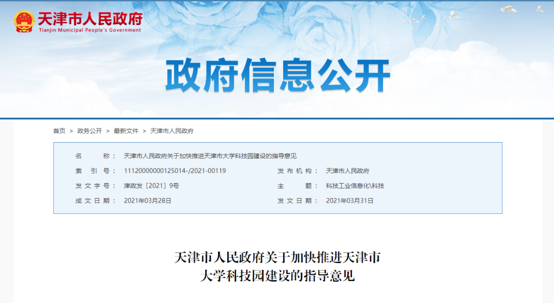 日前,天津市人民政府关于加快推进天津市大学科技园建设的指导意见在天津政务网发布