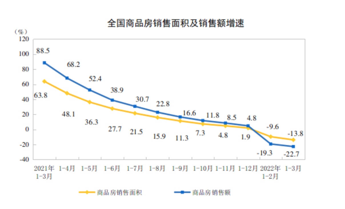 就现在房企的心态来看,如果销售市场的数据没有实质性的改善,其拿地方面的意愿确实会弱,另外即便是近期有拿地的房企,也普遍是央企和国企,民企拿地的积极性不高。商品房销售额同比降22.7%从销售数据看,按照国家统计局数据,1-3月份,商品房销售面积31046万平方米,同比下降13.8%;其中,住宅销售面积下降18.6%。商品房销售额29655亿元,下降22.7%;其中,住宅销售额下降25.6%。