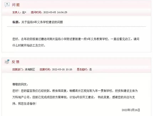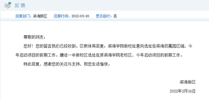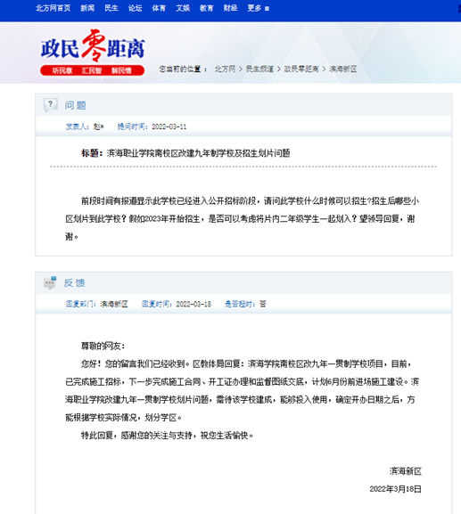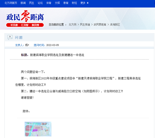前不久,有网友在政民零距离上留言,询问了“新建滨海职业学院选址以及新建塘沽一中选址”的问题。
