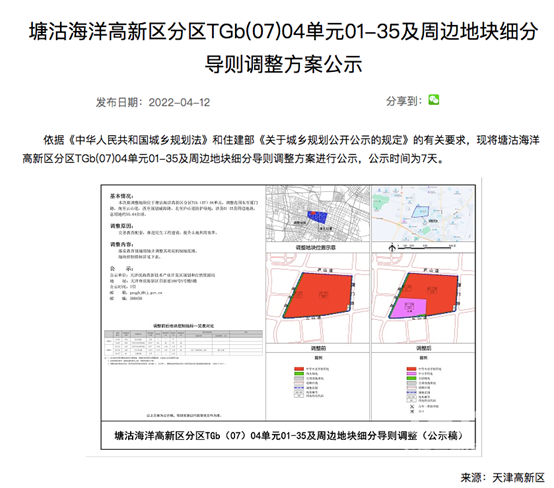 近日,塘沽海洋高新区规划和自然资源局释出《塘沽海洋高新区分区TGb(07)04单元01-35及周边地块细分导则调整方案公示》。
