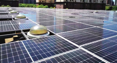 生态城不动产登记中心楼顶上铺设的光伏发电板和导光筒