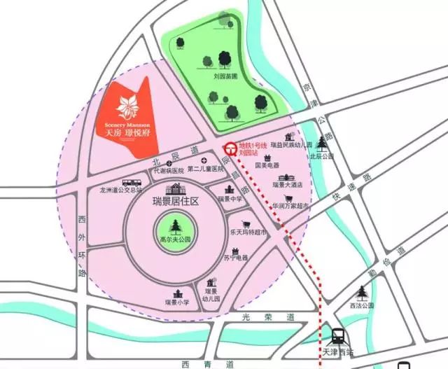 1、天房璟悦府距离地铁1号线刘园站仅600米(直线距离)。