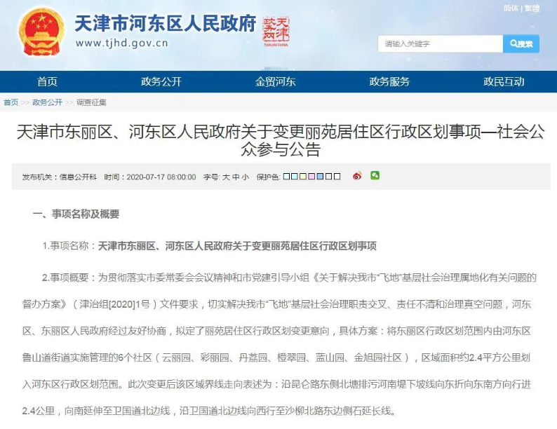 日前,天津市河东区、东丽区人民政府发布公告,拟变更二号桥地区、丽苑居住区行政区划。