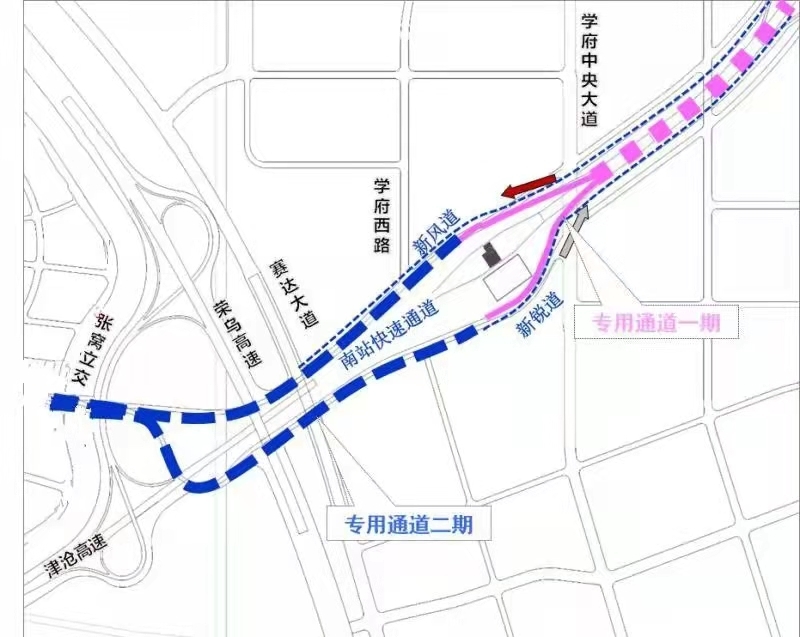 南站科技商务区未来定位为天津城市西部门户和京津冀重要综合交通枢纽,着力推进对外联络线,专用通道一期已竣工收尾,专用通道二期和瑞达路正在加快推进中,统筹推进周边配套16条道路建设。南站除了京沪高铁、京津城际,未来还规划有津沧城际、津雄城际。