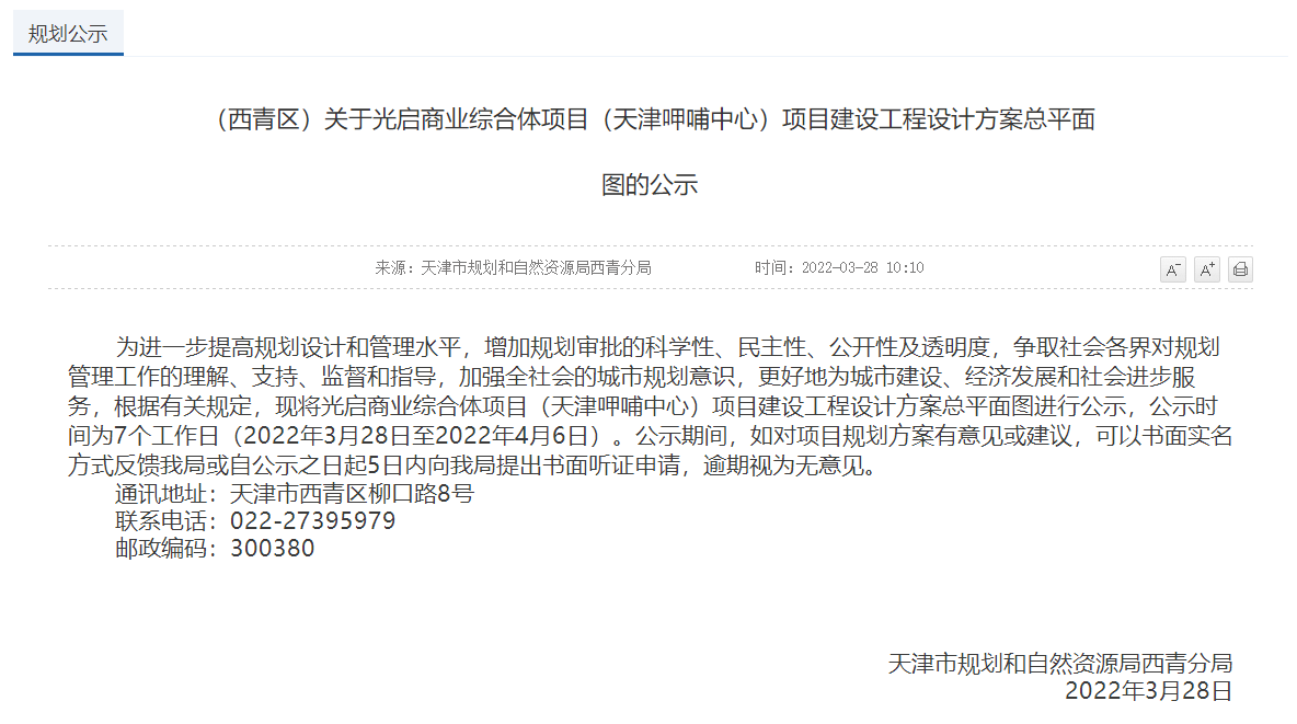 3月28日,天津市规划和自然资源局西青分局公示了《(西青区)关于光启商业综合体项目(天津呷哺中心)项目建设工程设计方案总平面图》。