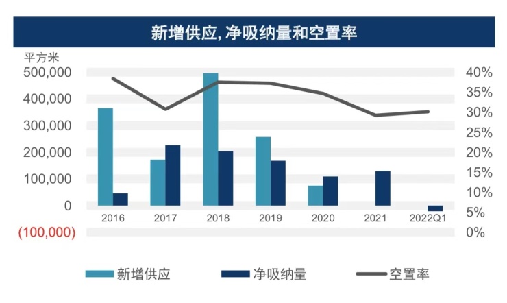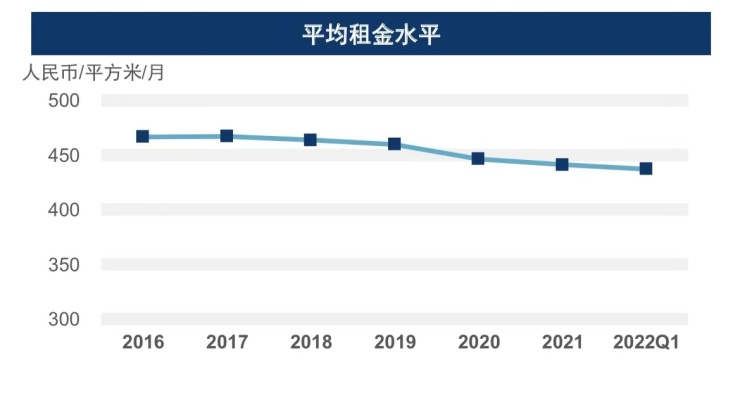 2022年排名前列季度,天津无新增写字楼项目入市。天津市区甲级写字楼市场存量稳定在238.5万平方米。反复的疫情为成交带来较大影响。同时,受到双减政策及部分企业经营不善等因素共同作用,本季末净吸纳量再次下滑至负值区间为-20,767平方米,推升市场空置率环比上升0.9个百分点至30.1%。本季度,全市平均成交租金水平表现平稳,与上季度持平为每月每平方米人民币89.1元。