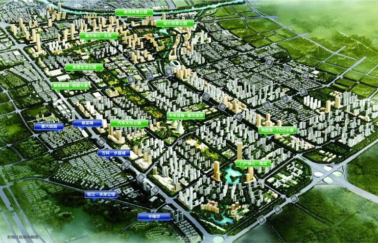 根据规划,新梅江板块以两核、三轴、四带为框架,进行复合化区域功能开发,即:一个城市核心区,与文化中心功能呼应;一个城市门户区,与津南、西青产业园区功能呼应;三大景观绿轴,梧桐大道、都市绿洲、TOD水廊;四大主题公园,海河公园、设计公园、家居公园、汽车公园,整体定位是一直以来是以纯居住功能为主。