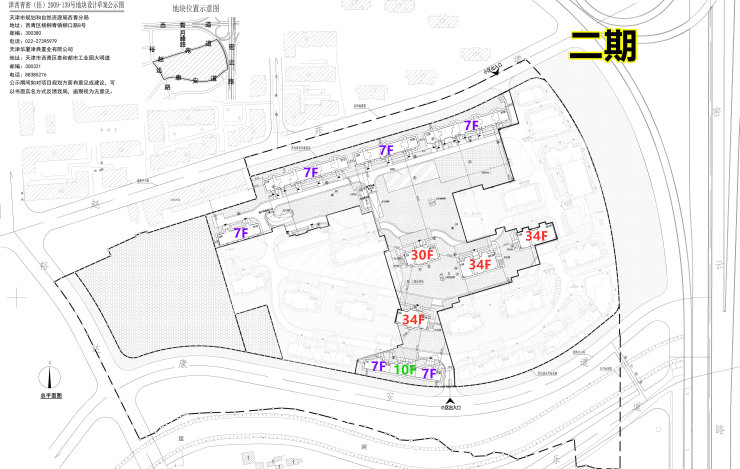 项目二期位于中部,11栋住宅楼,包括6栋7层到顶洋房,1栋10层到顶小高层,4栋30、34到顶高层。