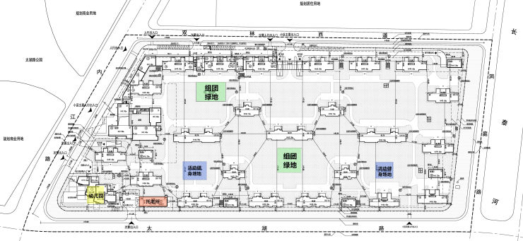 此外,在地块中间位置还规划了两处组团绿地和居民活动、健身场地。在地块西南位置分布了一所幼儿园和一个托老所,满足居民日常生活所需。