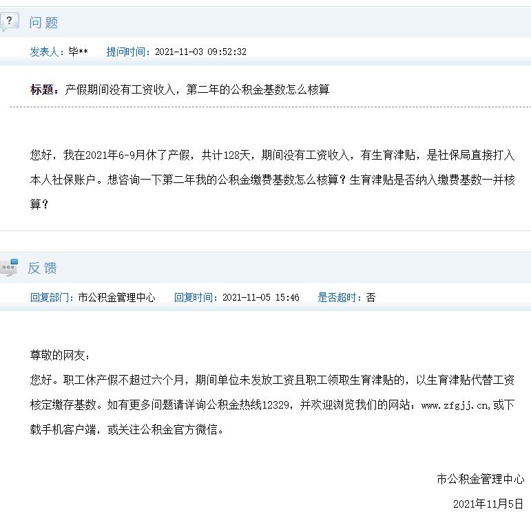 《政民零距离》栏目网民“毕**”留言:您好,我在2021年6-9月休了产假,共计128天,期间没有工资收入,有生育津贴,是社保局直接打入本人社保账户。想咨询一下第二年我的公积金缴费基数怎么核算?生育津贴是否纳入缴费基数一并核算?