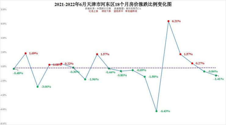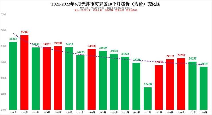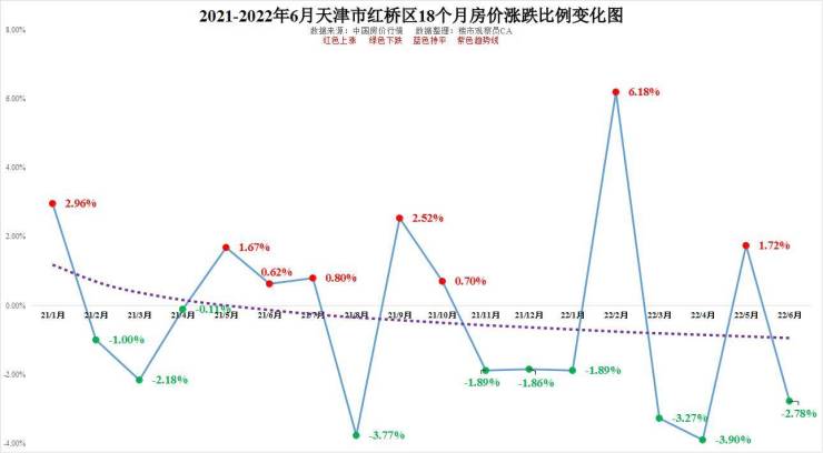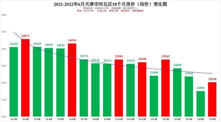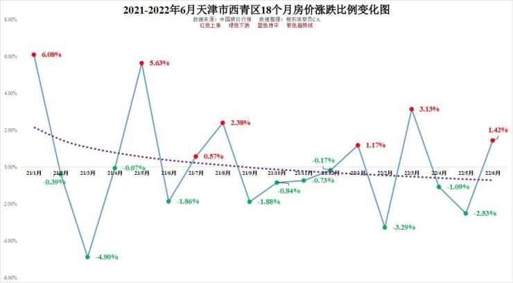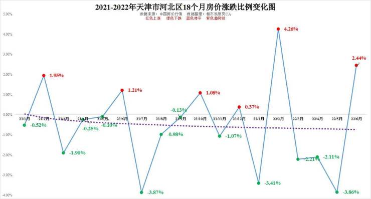 下图为2021-2022年6月天津市河北区18个月房价涨跌比例变化图。在趋势线上可以看出下行区。虽然6月份出现了较大的上涨,但是底部似乎没有出现。进入2022年以后价格波动较大,如果有购房打算可以期待下个月的数据。