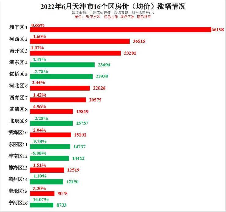 天津作为国家较早的直辖市,经济、旅游等在改革开放以后得到了巨大的发展。2022年已经过半,天津房价发生了哪些变化呢?下图为2022年6月天津市16个区房价变化图。