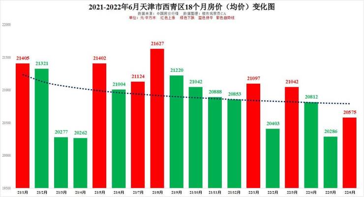 下图为2021-2022年6月天津市西青区18个月房价(均价)变化图。西青区虽然价格波动较大,但是在趋势上表现得比较平稳。较高均价出现在2021年8月为21627元/平方米,较低均价出现在2021年4月为20262元/平方米。但是在18个月变化中跌幅较多,上涨占比小。