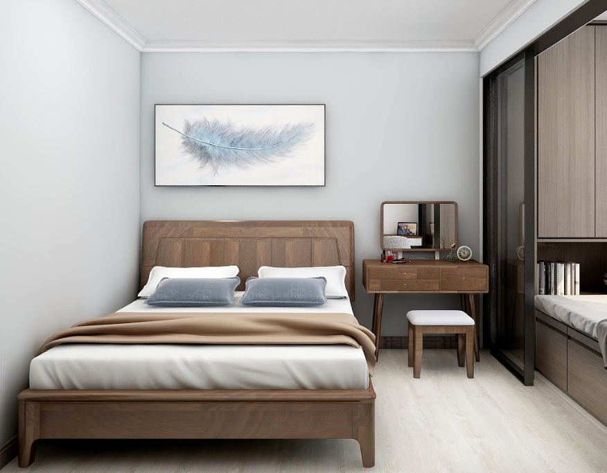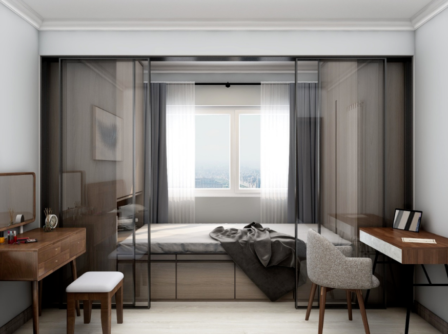 该设计中,卧室算是相当有特色的。该房屋是一位业主为父母所打造,考虑到老年人夜间睡眠较浅,为不打扰彼此有分床睡习惯,但整居卧室仅此一间。故设计师将卧室一分为三,飘窗一侧以榻榻米+抽拉门的形式做成了一个独立空间,打造出左右双卧,中间为梳妆台&阅读区的格局,可谓别具匠心。
