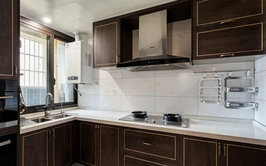 厨房的风格与整体居室相契合,同时更注重实用性,浅色墙砖既让空间不显得沉闷,又带来整洁干净的空间印记,金色线条的点缀又让厨房在古典中透露出跃动的现代气息。