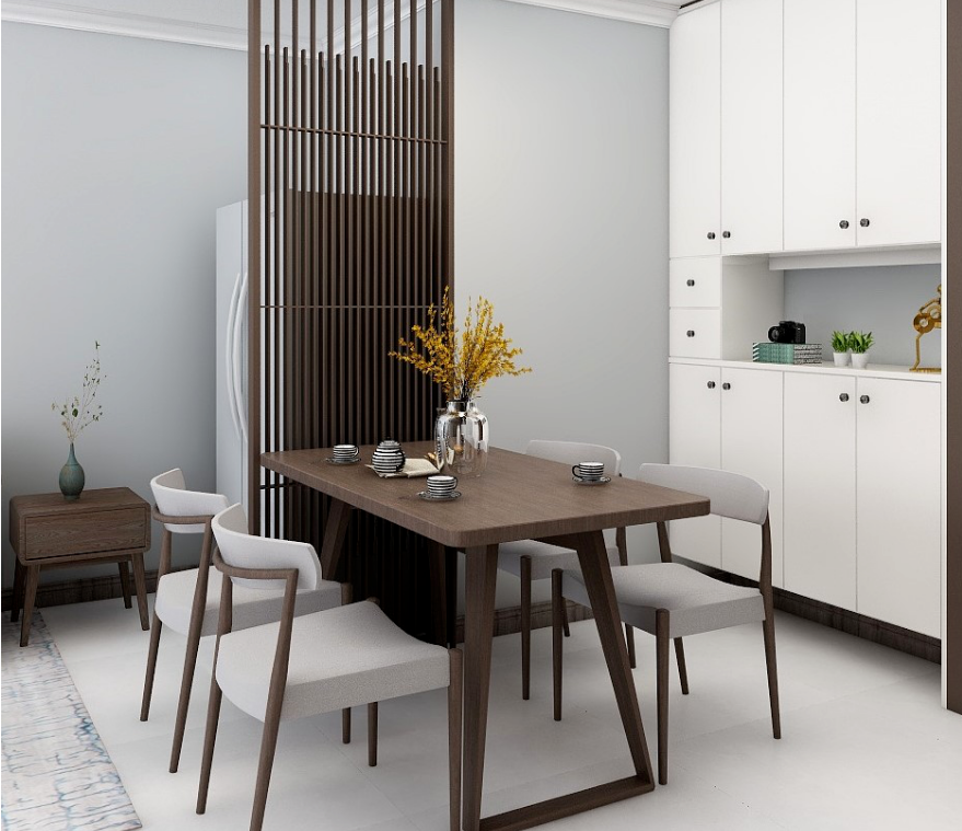 尽管受限于空间的制约,但设计师还是以足够的想象力对客厅与餐厅进行了层次切割,格栅屏风的运用,恰到好处地在一个区域内划分了功能空间,同时屏风还优质将体积较大的冰箱隐藏了起来。同时,侧面墙柜收纳与展示融为一体,功能性和美观性同步输出,配合暗色餐桌,形成了“稳重静谧”的视觉效应,带来一种轻松舒适的用餐环境。