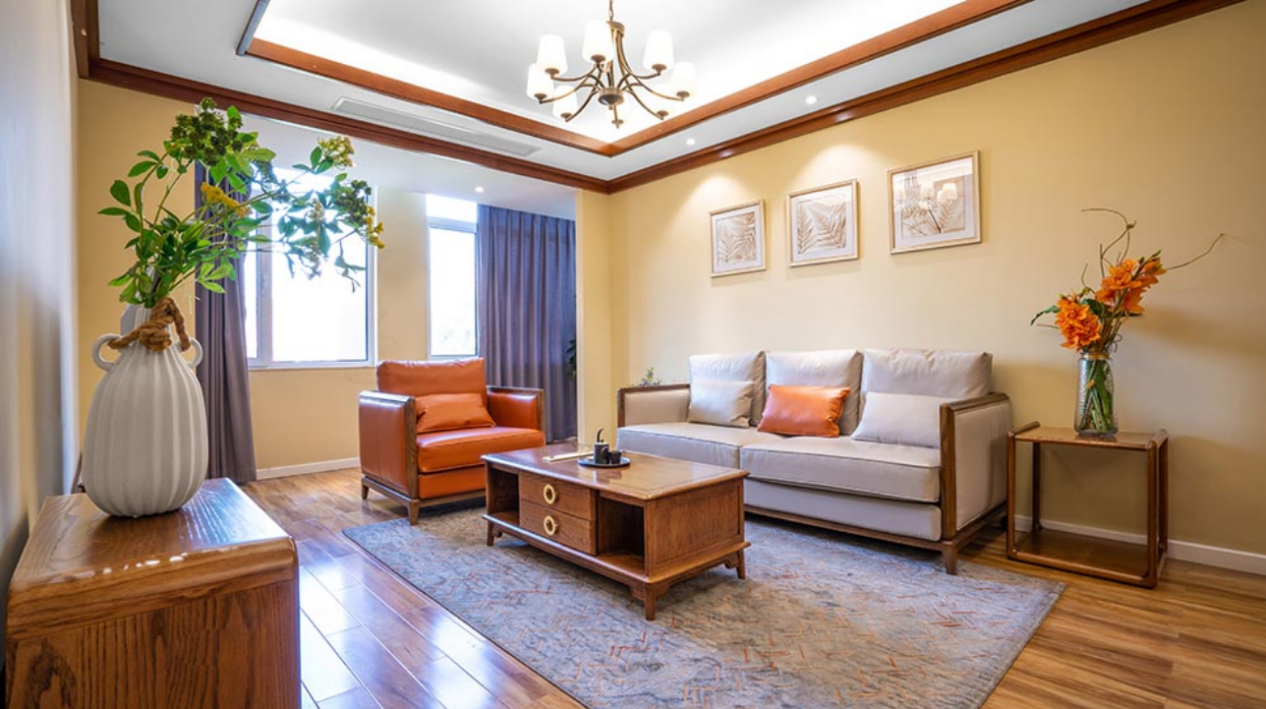 风格古朴、简约又具备现代元素,对于客厅的排名前列感觉是否就已经相当“吸睛”了呢?该设计是北京全包圆装修设计师以新中式风格下的“闲庭落英”样板间为蓝本进行的再发挥。众所周知,新中式吸收了传统中式的国风魅力,同时又将人文深度与现代艺术融为一体,不仅适合中老年人,对年轻群体也同样非常友好。
