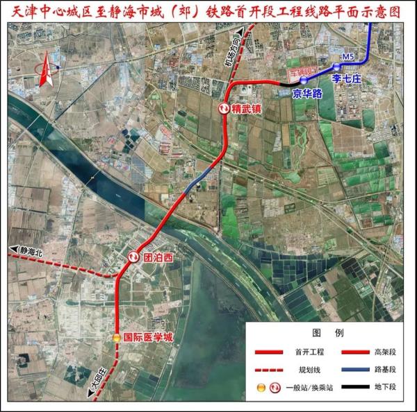 天津市中心城区至静海市域(郊)铁路工程位于天津市西青区和静海区,是静海区与中心城区间快速轨道交通线路。首开段工程南起静海区国际医学城站,经主支线接轨站团泊西站进入主线并最终连接至西青区京华路站,与5号线衔接。线路全长13.4公里,其中高架段11.4公里,过渡段1.4公里,地下段0.6公里。设站3座,分别为国际医学城站、团泊西站、精武镇站,均为高架站。
