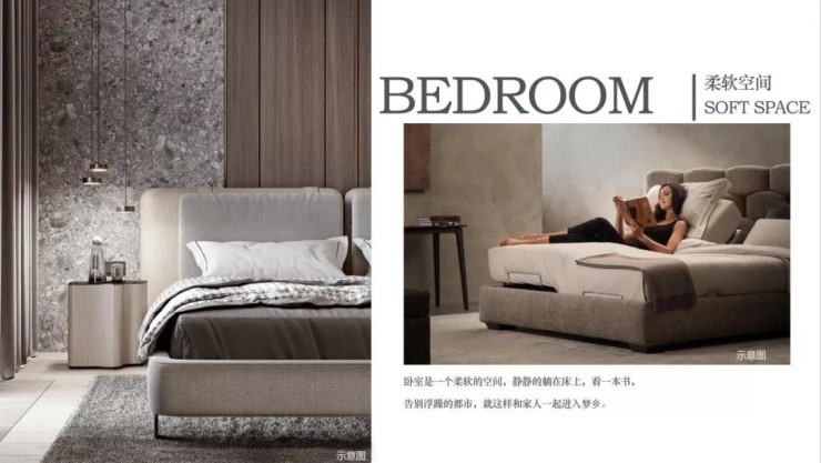 譬如在休憩的卧室以高级灰为主色的墙布为主,高品质的亚麻色背景墙布让卧室具有轻盈、柔软似棉花般的空间联想,让平日高度集中的神经进入卧室就得到彻底的放松,极大加深了生活的幸福感。