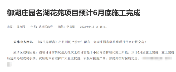 武清区政府回复:该项目目前情况是此批次工程目前处于小区内园林绿化施工阶段,预计6月底施工完成,施工完成后通知办理收房手续。黄庄街本着维护广大业主权益,积极对接地产商,督促其按时保质交房。