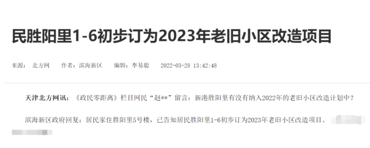 滨海新区政府回复:居民家住胜阳里5号楼,已告知居民胜阳里1-6初步订为2023年老旧小区改造项目。