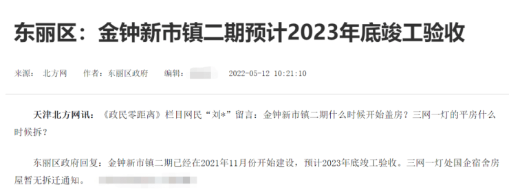东丽区政府回复:金钟新市镇二期已经在2021年11月份开始建设,预计2023年底竣工验收。三网一灯处国企宿舍房屋暂无拆迁通知。