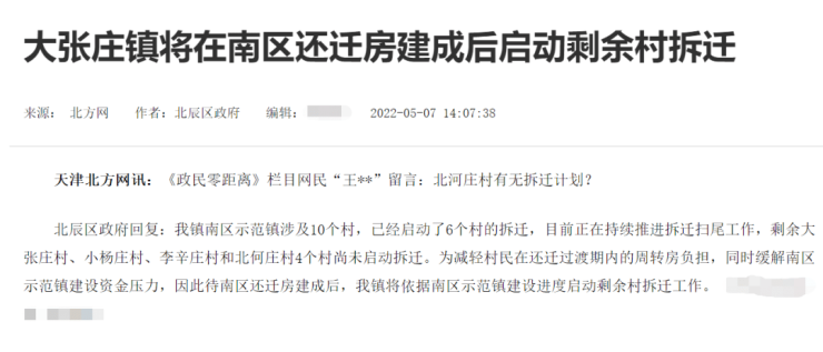 北辰区政府回复:我镇南区示范镇涉及10个村,已经启动了6个村的拆迁,目前正在持续推进拆迁扫尾工作,剩余大张庄村、小杨庄村、李辛庄村和北何庄村4个村尚未启动拆迁。为减轻村民在还迁过渡期内的周转房负担,同时缓解南区示范镇建设资金压力,因此待南区还迁房建成后,我镇将依据南区示范镇建设进度启动剩余村拆迁工作。