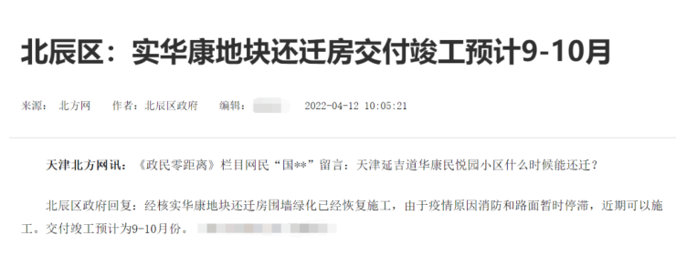 北辰区政府回复:经核实华康地块还迁房围墙绿化已经恢复施工,由于疫情原因消防和路面暂时停滞,交付竣工预计为9-10月份。