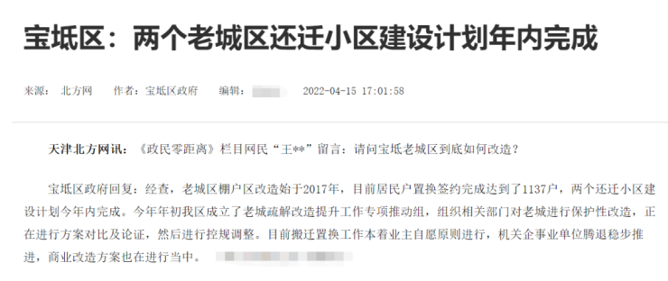 宝坻区政府回复:经查,老城区棚户区改造始于2017年,目前居民户置换签约完成达到了1137户,两个还迁小区建设计划今年内完成。今年年初我区成立了老城疏解改造提升工作专项推动组,组织相关部门对老城进行保护性改造,正在进行方案对比及论证,然后进行控规调整。目前搬迁置换工作本着业主自愿原则进行,机关企事业单位腾退稳步推进,商业改造方案也在进行当中。