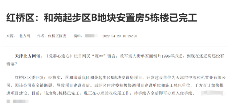 红桥区区委回复:经核实,营和园系我区和苑起步区B地块安置房项目,开发建设单位为天津市中冶和苑置业有限公司,因该公司资金链断裂,导致项目建设滞后。后经区住建委积极协调项目建设单位和施工总包单位,千方百计加快推进项目建设。目前,该地块5栋楼已完工,现正在办理验收收尾工作,待手续齐全后即可办理入住手续。
