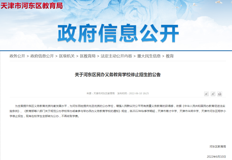 为全面提升我区义务教育优质均衡发展水平,为河东百姓提供充足优质的公办学位,增强人民群众对公平而有质量义务教育的获得感,依据《中华人民共和国民办教育促进法实施条例》、《教育部等八部门关于规范公办学校举办或者参与举办民办义务教育学校的通知》规定,自2022年秋季学期起,天津市育才中学、天津市华英中学、天津市河东区翔宇小学停止招生,现有在校学生全部转为公办,不再收取学费。