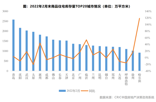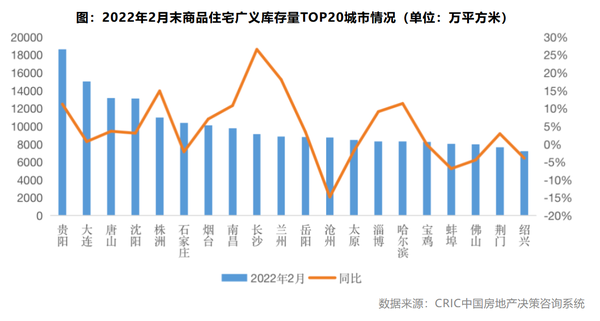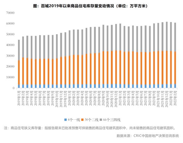 狭义库存来看,据CRIC监测数据,2022年2月百城商品住宅库存量达到了60874万平方米,环比微降1%,同比增长5%。